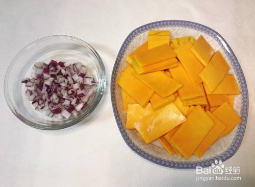 南瓜去皮切成薄片,洋葱切成细丁。