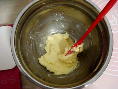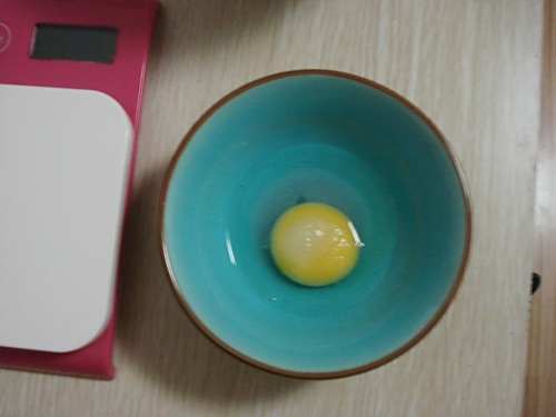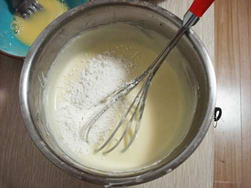 44、在蛋黄中加糖、水、盐,拌匀融化;