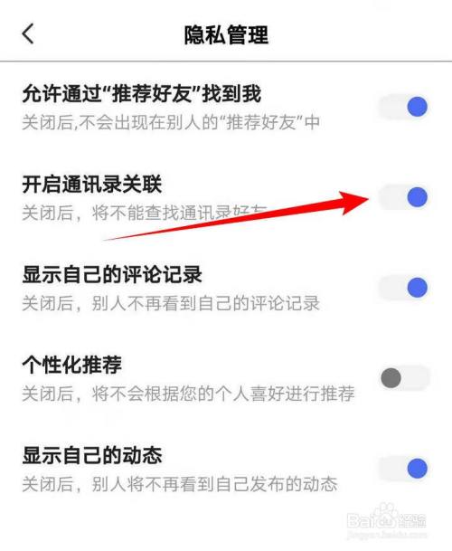 打开隐私管理页面,看到开启通讯录关联,选择右侧的开关取消关联;