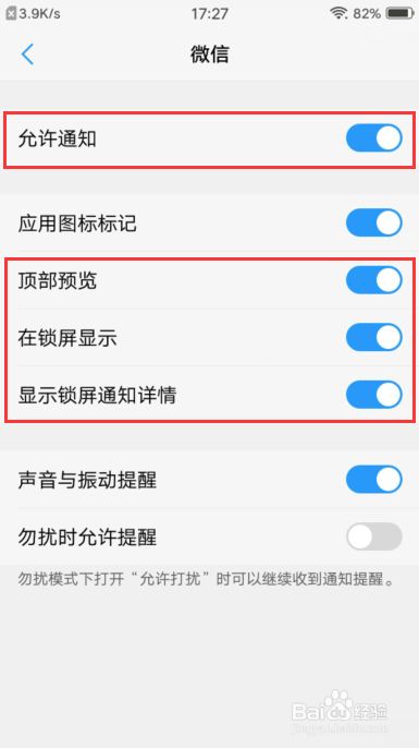 5、进入到微信以后,首先将”允许通知“的开关开启,然后再将”顶部预览“、”在锁屏显示“和”显示锁屏通知详情“这三项的开关开启即可。