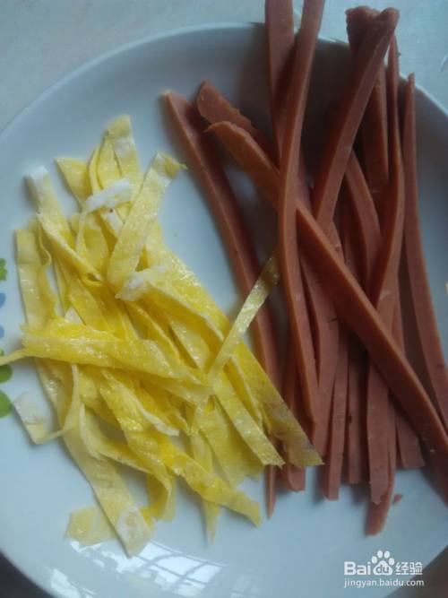 准备配菜,鸡蛋摊成蛋饼,再切成长条,火腿切成长条,要是有黄瓜和胡萝卜更好,家里没有我这次就没放,反正可以放自己喜欢吃的一切东西。