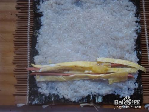 铺上米饭,米饭不要铺的太满,大约0.5厘米厚就行,四周要留出1厘米左右的空,然后盖上保鲜膜将米饭弄平整了。如果在米饭上再抹上层沙拉酱味道更好,家里的沙拉酱吃完了,这次没放。