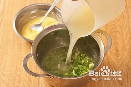 将小油菜碎放入锅中,加入高汤,以中火烧开。