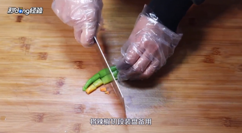 辣椒切段,装盘备用。