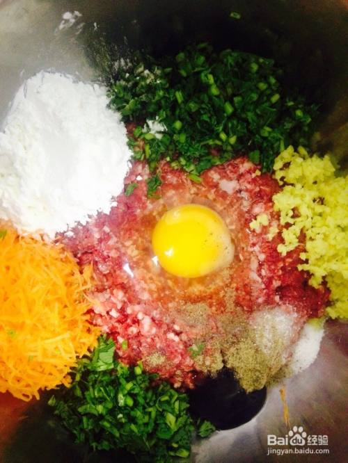 将肉馅。胡萝卜丝,香菜。姜末,鸡蛋放在一个容器里面,加入淀粉。蚝油。盐。黑胡椒粉。生抽。