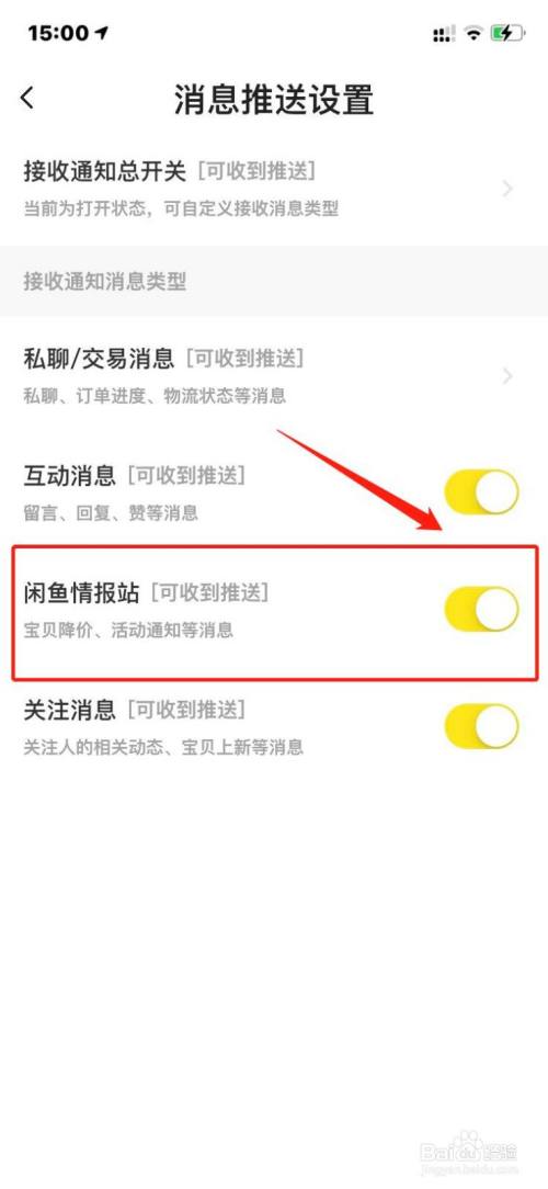 在设置页面根据自己的需要设置接受的消息,例如不想接受闲鱼情报站的消息,那么点击右侧的按钮
