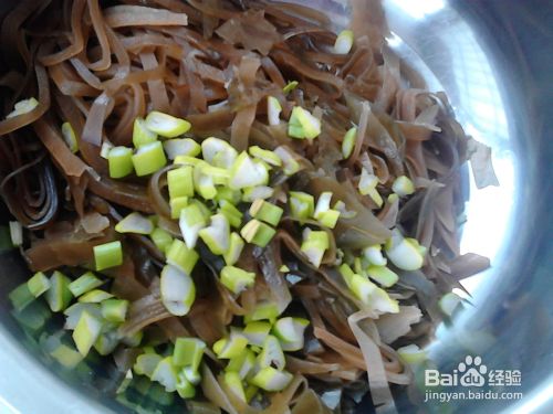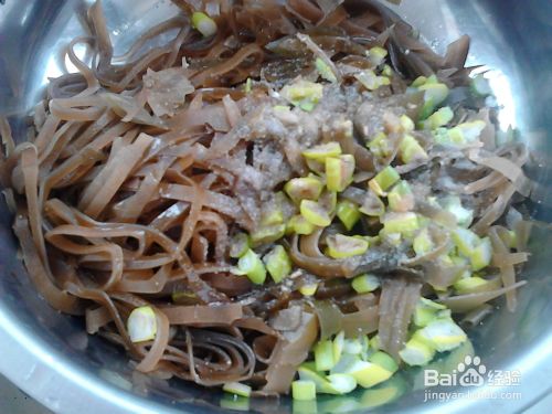 然后加入各种调料,热锅中倒入适量的油,等油热后,将热油均匀的倒入海带丝上,开始搅拌。