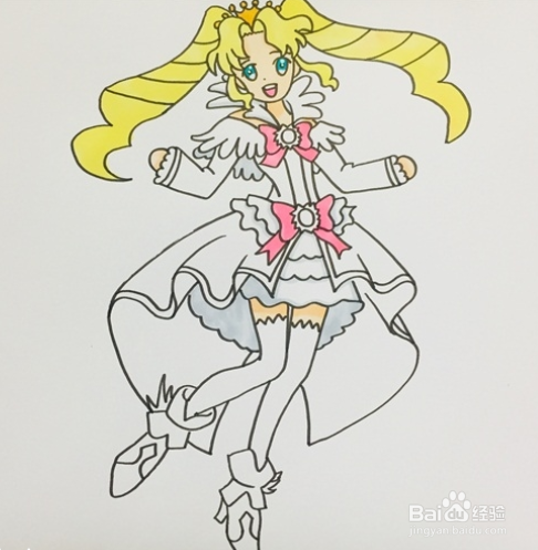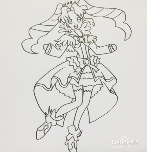 继续画出她的下半身,裙子是前短后长的,注意画出裙子的褶皱纹理,并画出伶俐公主的纤细长腿,脚上穿着高跟的鞋子,整个人物就画出来啦!