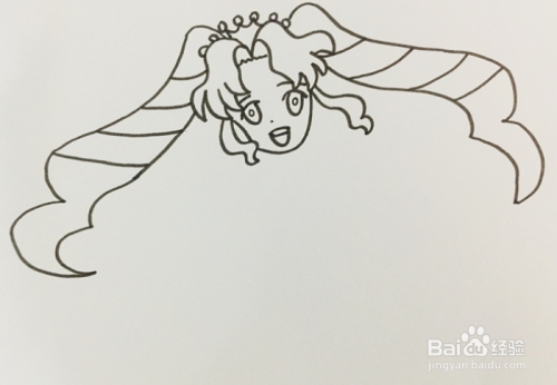首先我们画出彩俐公主的头部,先画她的刘海,头顶画上装饰,再画出两边长长的马尾辫,画出她的五官,眼睛大大的,嘴巴张开着。