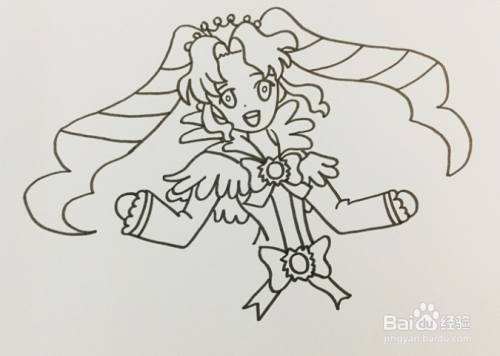 接着画出她的身体,衣服领子和袖子部分有点像翅膀的纹理,胸前有大大的蝴蝶结,双手展开向上弯曲,画出纤细的腰部,并在腰部也画上蝴蝶结。