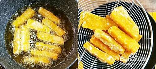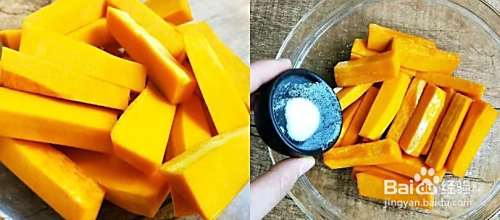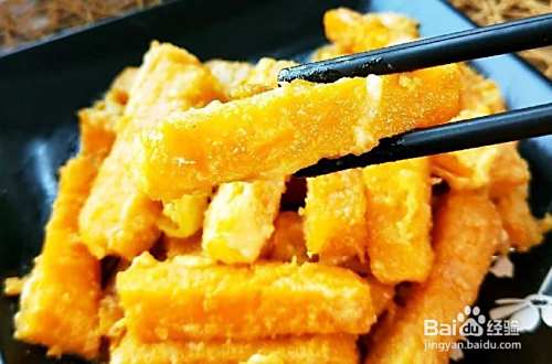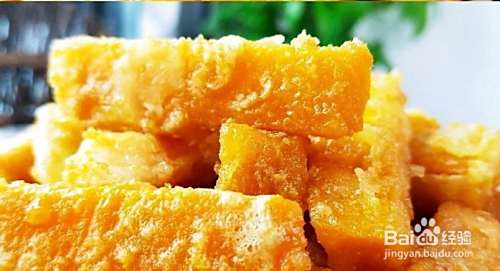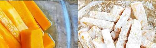 起油锅,待油烧至5成熟时,下南瓜条,保持中小火一直炸至南瓜熟透,然后捞出沥干油;