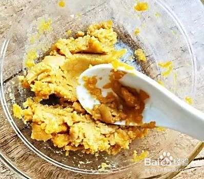 把咸鸭蛋的蛋黄取出,碾碎放入碗中;