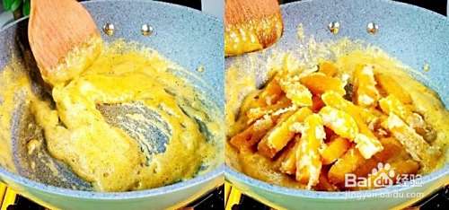 另外用一个锅,起锅烧油,倒入咸蛋黄,开小火慢慢炒香,再放入炸过的南瓜条;