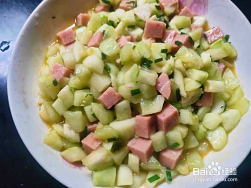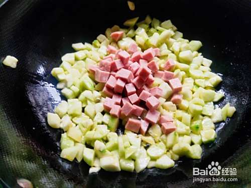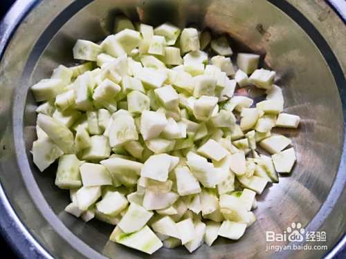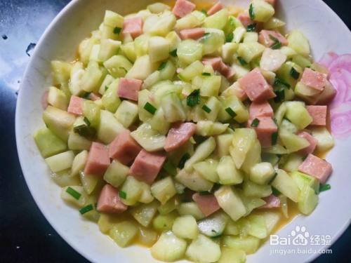 黄瓜去皮,洗净切成丁,午餐肉也同样切成丁。