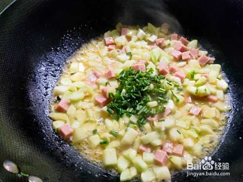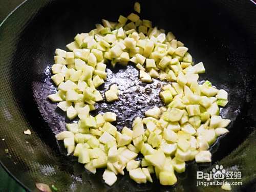 将黄瓜丁放入锅中炒至黄瓜断生。