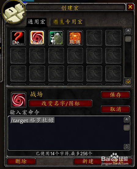 我们依次点击ESC-宏命令设置,打开宏命令制作界面,制作一个“/target 格罗杜姆”的《战场》宏并把它拖到快捷栏里。