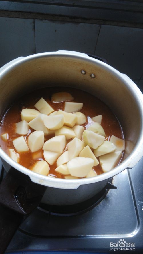 排骨煮熟后,打开锅盖,加入备好的土豆;