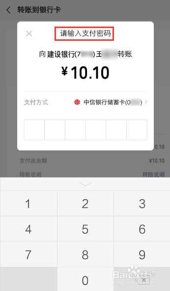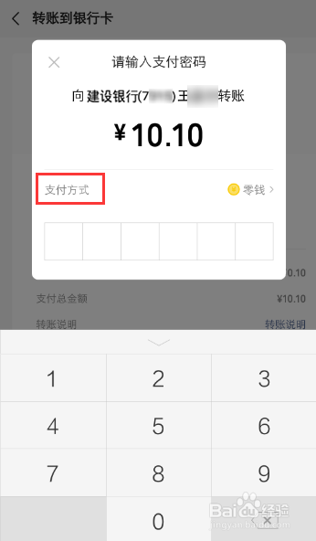 设置支付方式后,再输入支付密码,准备转账。