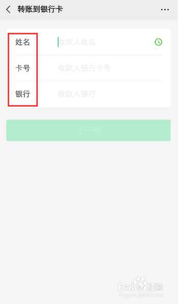 在银行卡转账页面,输入姓名、银行卡号、哪家银行。