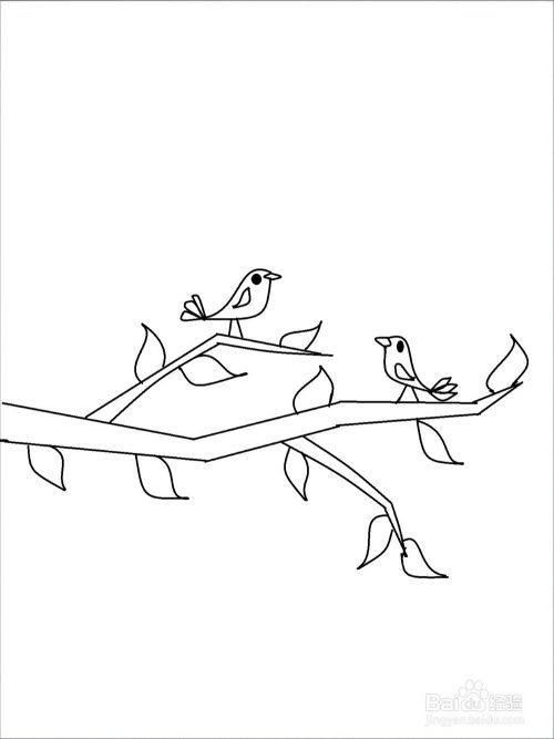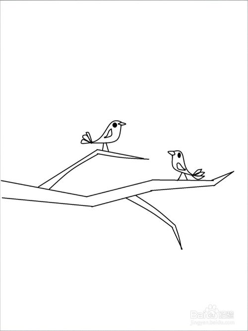 接下来茁两只细细的腿脚,还有三瓣羽毛的尾巴。然后用相同的方法把另一个小鸟也画出来。