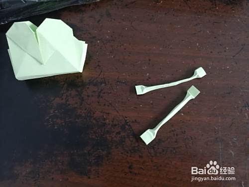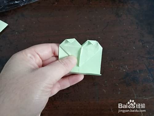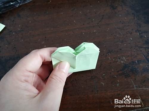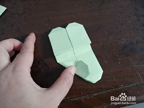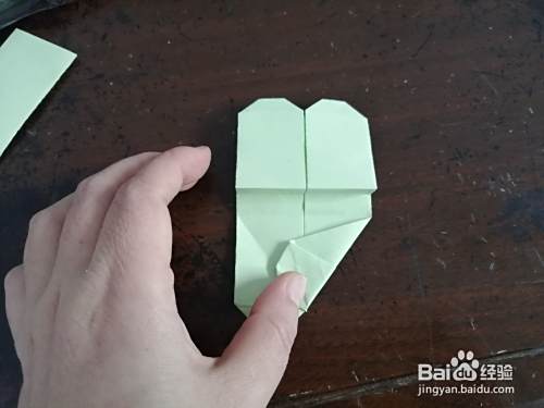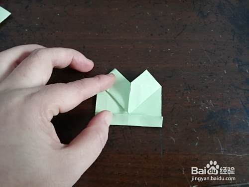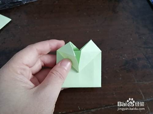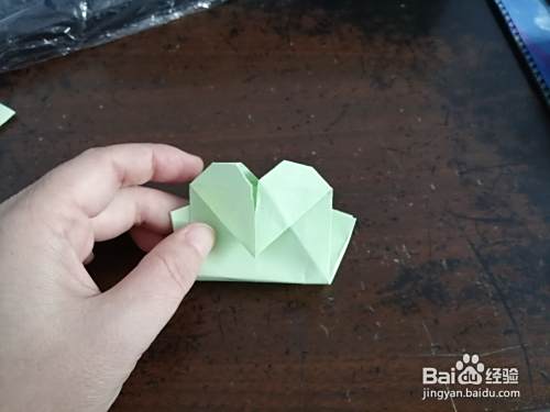 把下侧的边向上折,后边的向后折,如图二。把两侧的边向上掀起,如图三就成了心形,后边的一样操作。再把下侧的边向上折,如图四。