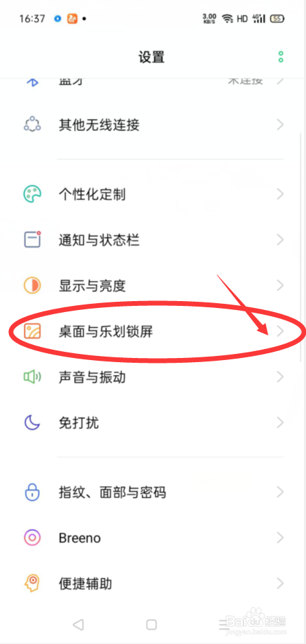 接下来,我们在进入OPPO手机设置主界面后,我们点击桌面与乐划锁屏按钮,进入桌面与乐划锁屏设置界面;