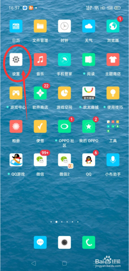 首先,我们打开手机,我们进入手机主界面,接着,我们点击设置按钮,进入OPPO手机设置主界面;