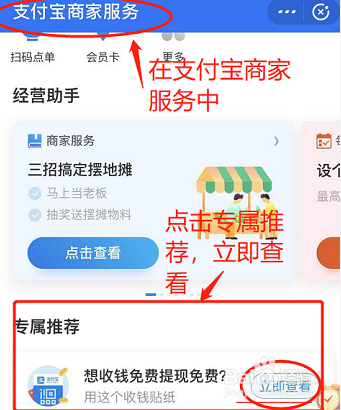 在支付宝商家服务页面中,找到"专属推荐“,点击”立即查看“,可以免费拿取收款码