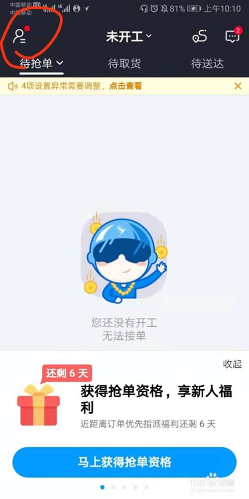 进入接单页面:登陆或者注册成功后,会进入页面,这时候点击左上角标志。