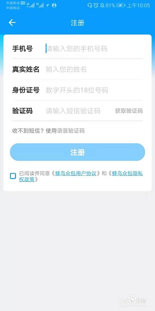 注册并登陆蜂鸟App:没有蜂鸟众包账号的需要想注册,填写个人真实信息。
