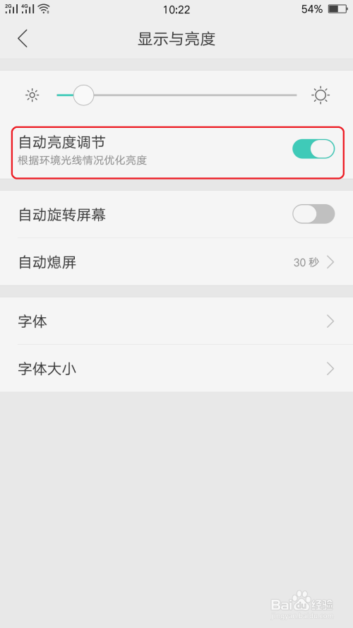 进入显示与亮度界面,将【自动亮度调节】的开关关闭即可。