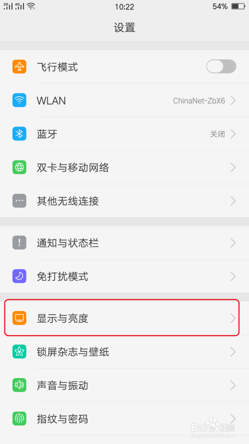 打开OPPO手机,在手机桌面上点击设置,下拉菜单,选择【显示与亮度】。