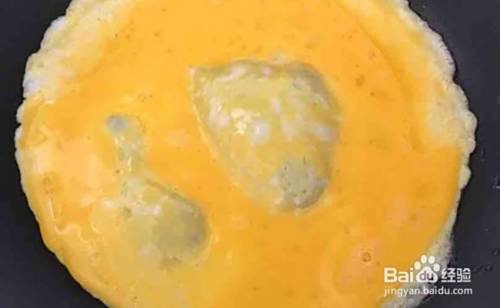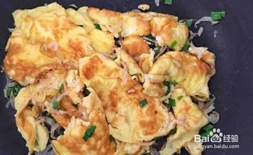 然后热锅放玉米油,倒入蛋液大火煎定型后划散,撒入2g盐。