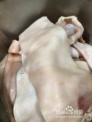 看捞出的肉皮!最累人的工作开始了,把肉皮上的肥肉用刀刮掉,残留的猪毛也要拔掉。这一步非常重要!肉皮上带肉和油脂是煮不出透明皮冻的。1780克肉皮清理干净我用了一个多小时。