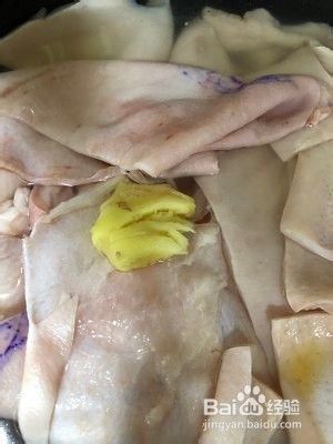 锅中添凉水,放入肉皮,扔进去一块拍松的姜,大火烧开水后煮5分钟,捞出。