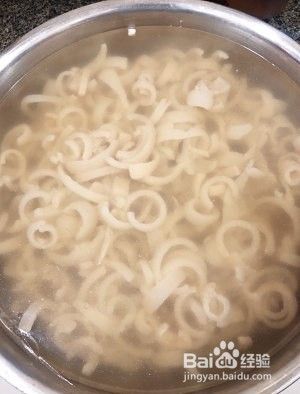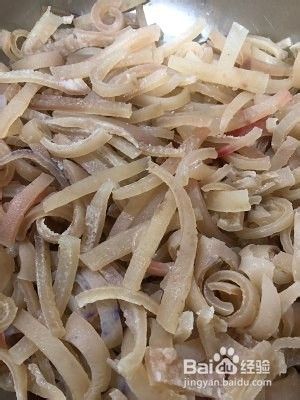 切丝或切丁。清理肉皮过程中肉皮变凉了,不好切,可以把它泡在温水中,边捞边切,就容易多了。