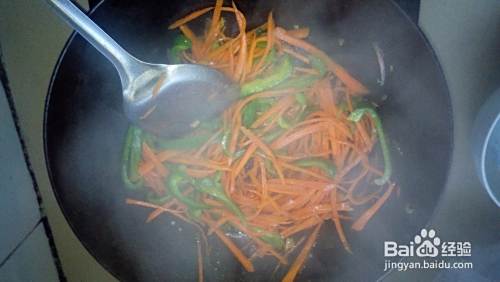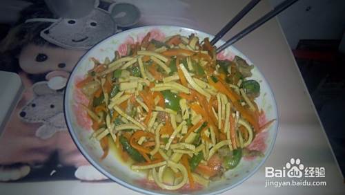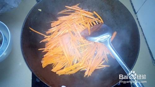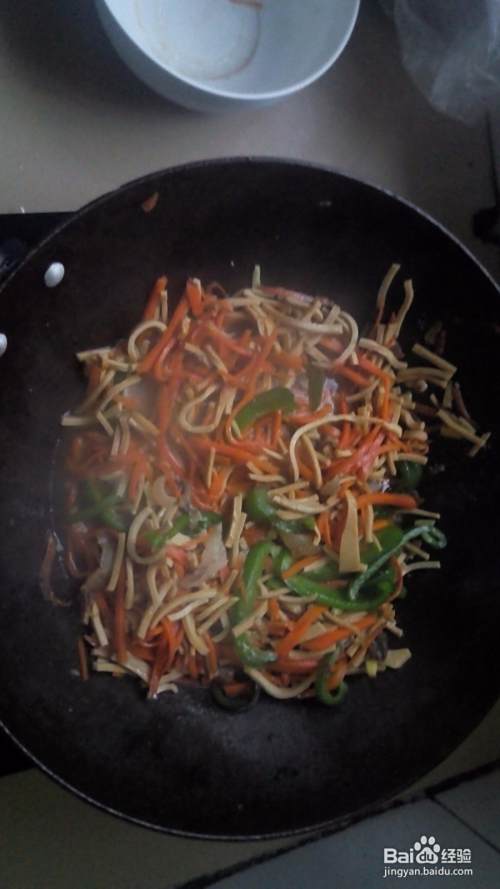 胡萝卜炒软,加入千张丝,炒好的肉一起大火翻炒几分钟。