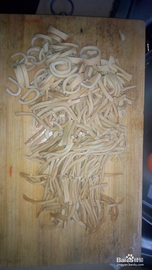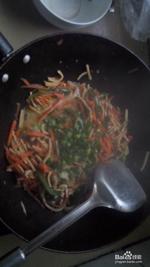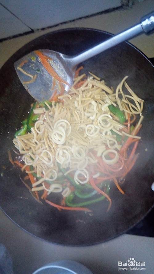 加入盐,翻炒,炒的过程中可以加少许的水,因为千张容易粘锅。几分钟后,加入适量水煮一下。