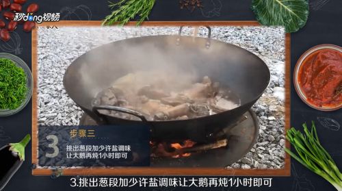 5挑出葱段加少许盐调味让大鹅在炖上1小时即可。