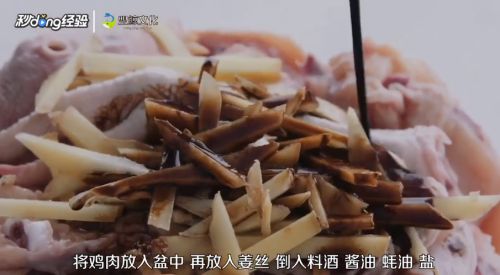 3将鸡肉放入盆中,再放入姜丝,倒入料酒、酱油、蚝油、盐。