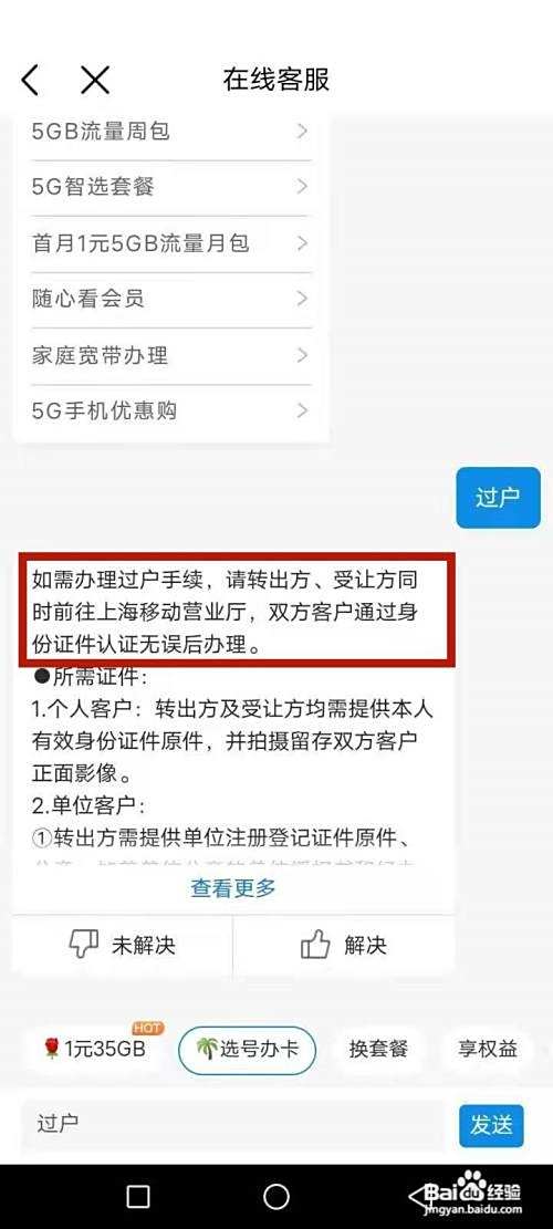 办理过户需要的证件等信息,过户双方持证件至营业厅办理。