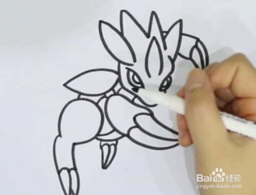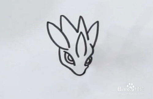 首先画出穿山王的头部轮廓,头顶上长着一片片的甲片,再来将穿山王的眼睛画出来。