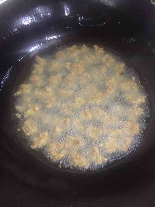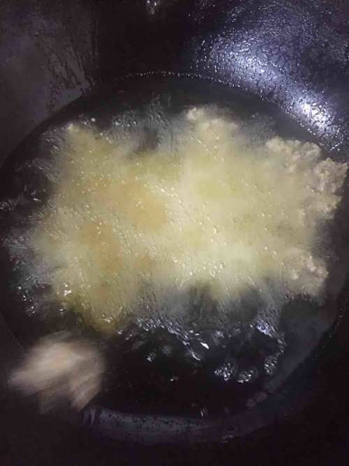 5起锅放油,将荔枝肉依次揪下一小块放入油中(油温在放下一块荔枝肉5秒内浮起来为准),放完后要搅拌荔枝肉(这样不会使炸出来的荔枝肉受热不均匀而导致的口感不一样)