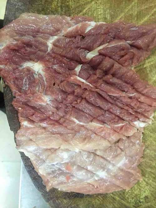 1将梅肉(剔除筋膜,口感会更好)切成片,用刀背敲打(这样在腌制的过程中能更好的吸收味道)