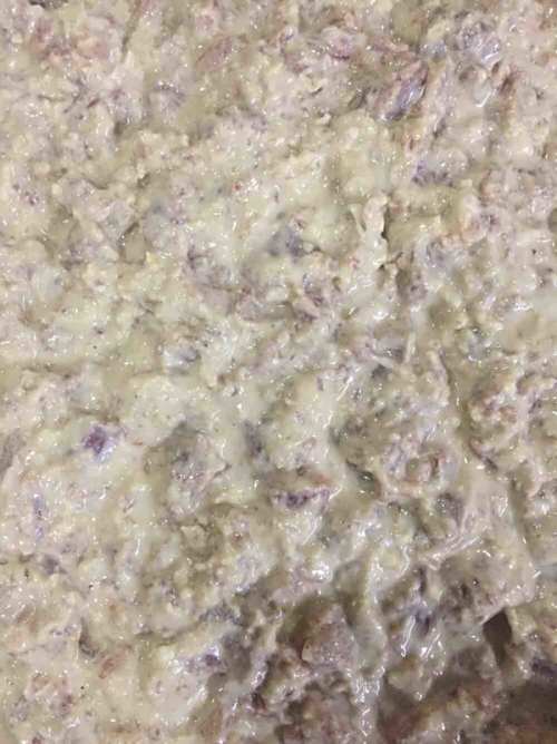 4再加地瓜粉和树脂粉搅拌均匀(炸之前根据湿黏的程度再适量的加点地瓜粉或树脂粉,以稍微不怎么粘手为准)