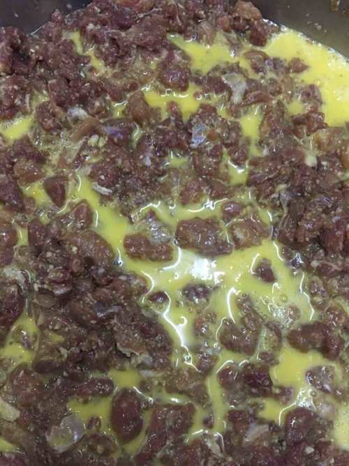 3按照比例将红葱头和蒜头切成细末放入较大的容器中,然后在容器中加入调料搅拌至白糖溶化后将切好的梅肉倒入容器中顺一个方向搅拌均匀,放置半小时左右让梅肉充分吸收味道!时间到后加入打好的鸡蛋搅拌均匀!