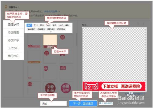 点击左侧水印图标选择,右侧预览调整水印图标大少及位置,确认创建点击【下一步,添加宝贝】,如下图: