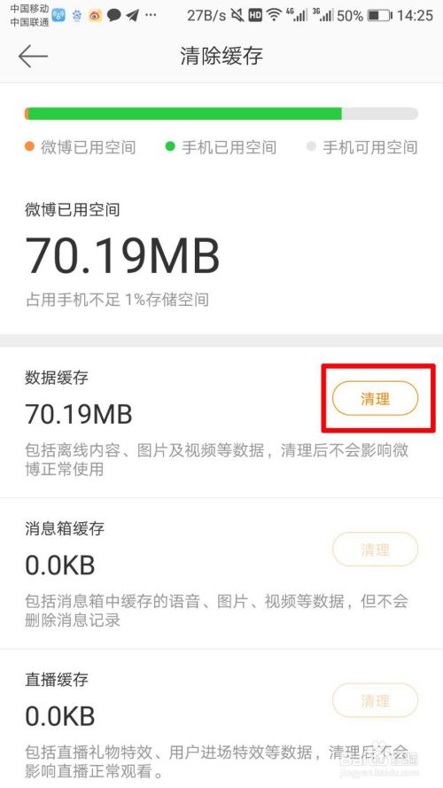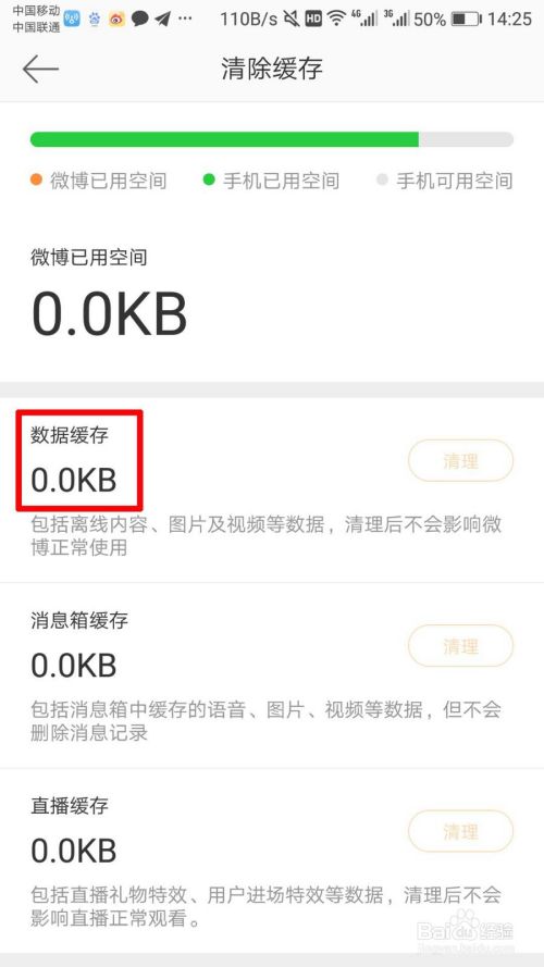 在清理缓存页面可看到微博数据缓存所占用的空间,点击【清理】;