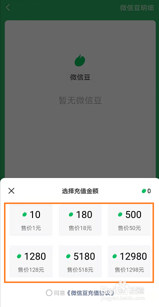 在微信豆界面中,点击【充值】,选择充值金额进行充值即可。