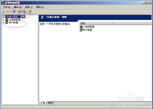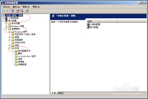 唤出"组策略"程序窗口,选择左侧"本地计算机策略→用户配置"文件夹。
